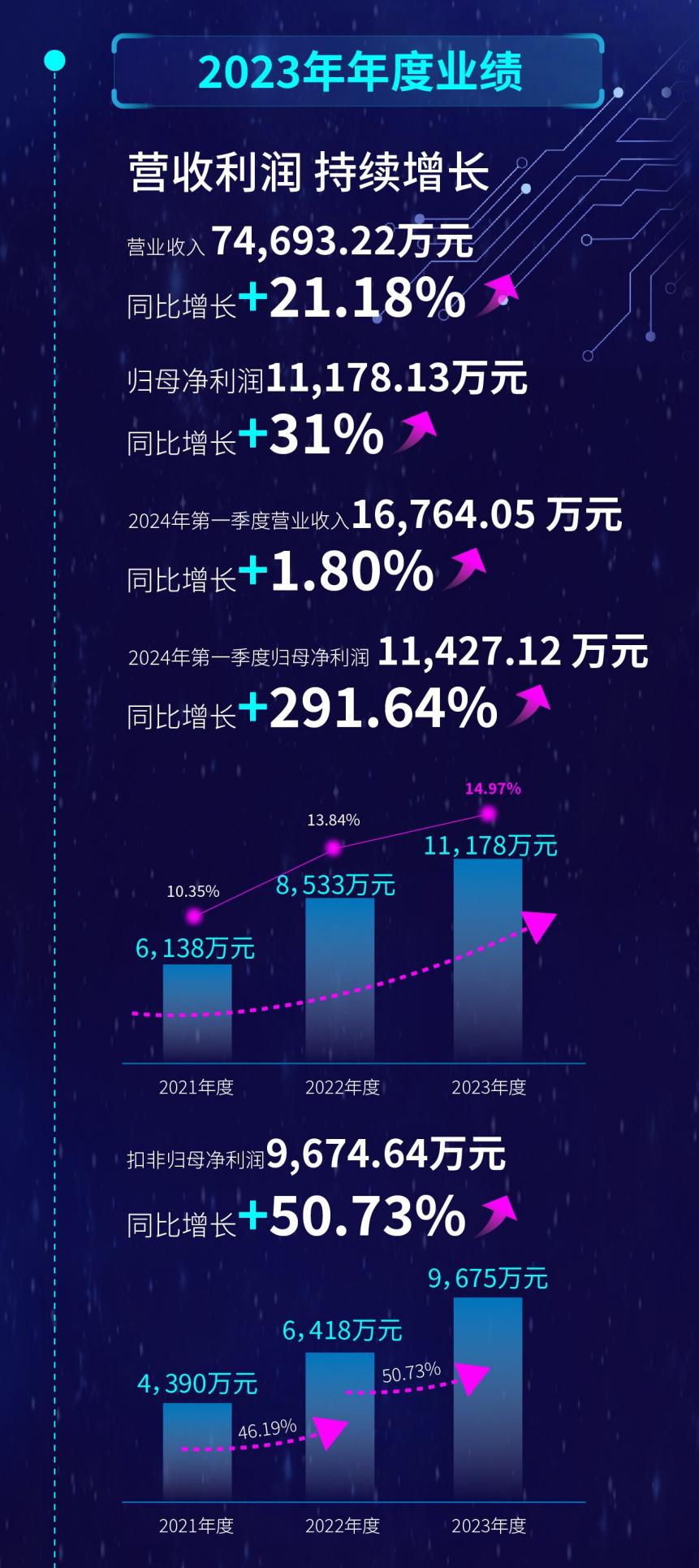 报告显示:2023年酷特智能归属于上市公司股东的扣除非经常性损益的净利润9674.64万元,较2022年增长50.73%;2022年6418.5万元,较2021年增长46.19%,扣非归母净利润同样连续三年实现增长。