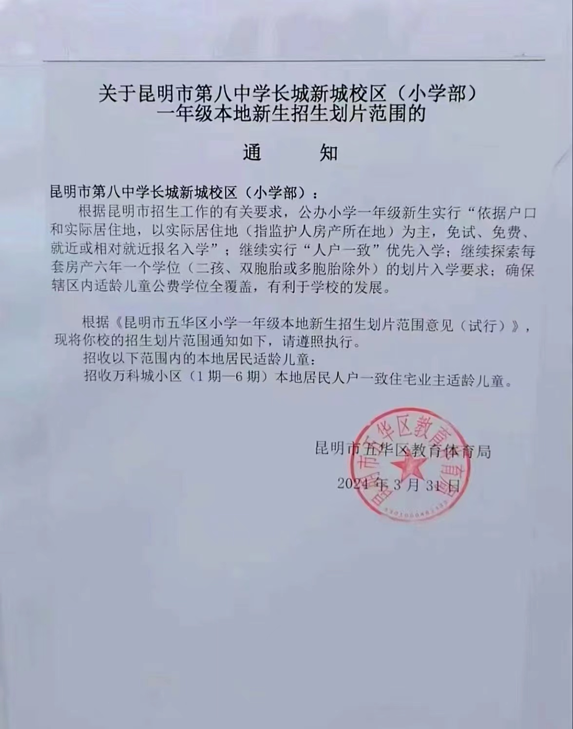 根据2024年教育主管部门发布的学校划片信息中:昆八中长城新城校区(小学部)明确招生范围为万科城小区(1-6期),本地居民人户一致的适龄儿童。