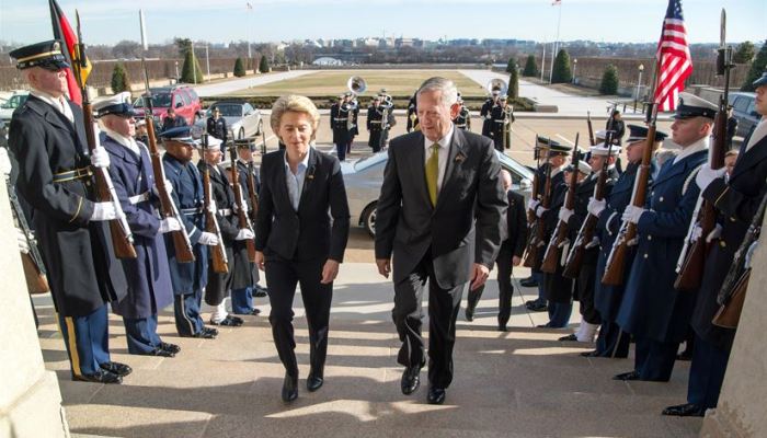 据美国Breitbart新闻网报道,当地时间10日,美国国防部长在五角大楼会见了德国国防部长德莱恩(von der Leyen)。他们两人讨论了同盟关系的重要性,不管是双边同盟关系还是多边同盟关系。