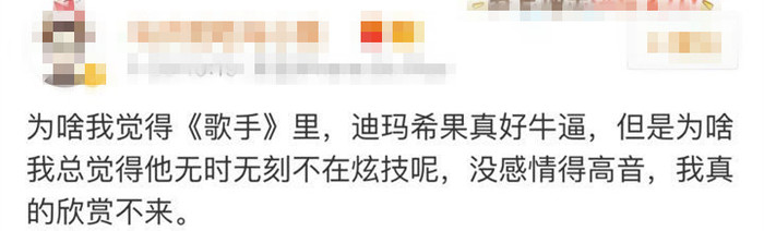 而现如今,迪玛希用高超的唱功征服众人的同时,突然又有许多人跳出来指责他“炫技”,称其“只懂飙高音,唱歌不走心,毫无美感。”瞬间又将技巧批判的一无是处,之前韩红和黄绮珊也都曾因此被黑。