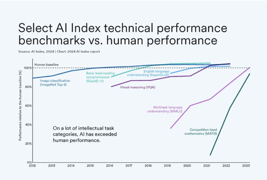 人工智能已在多项基准测试中超越人类,其中包括图像分类、视觉推理和英语理解。但在更复杂的任务上,如竞赛级数学、视觉常识推理和规划,人工智能依然落后于人类。