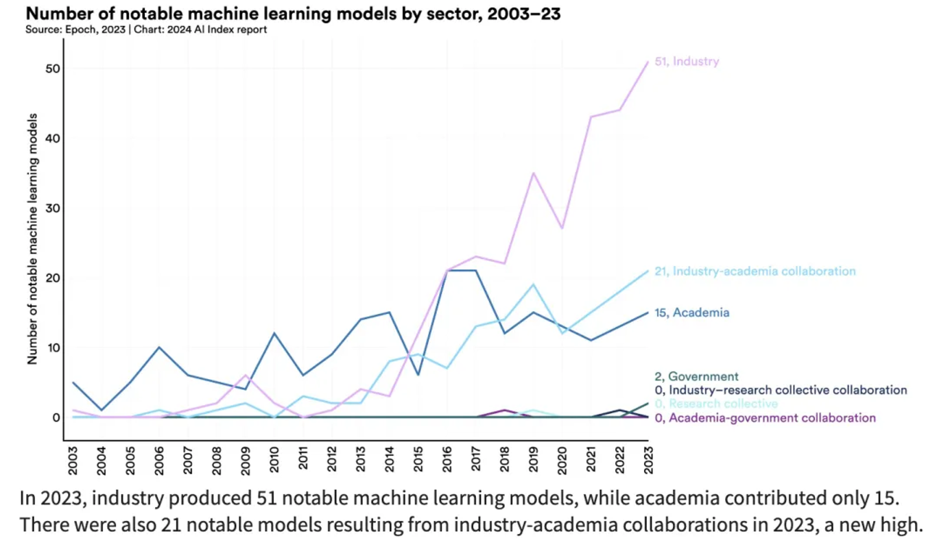 2023年,产业界在这一年内发布了51个引人注目的机器学习模型,而学术界仅仅贡献了15个。此外,产业界与学术界的合作也带来了21个著名的模型,这一数字创下了新高。