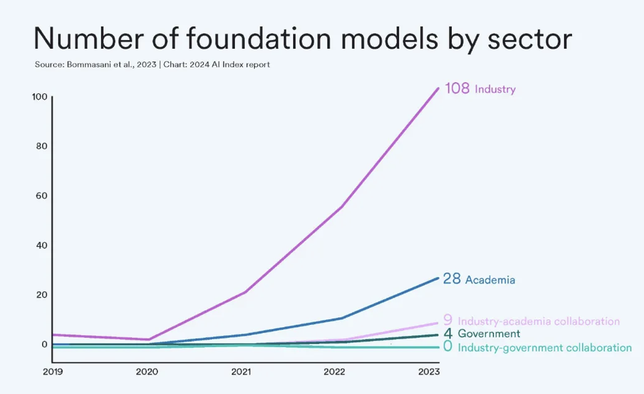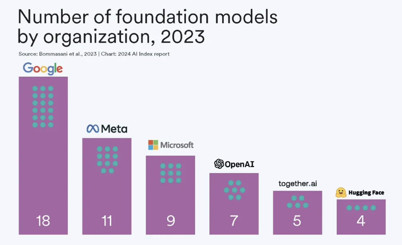 点评:人工智能在过去几十年的发展,有很长一段时间一直是学术界的顶尖科研人才在默默推动着,一直到这波大模型人工智能的浪潮才发生了改变。产业界丰富的财务资源、算力资源与顶尖AI人才,接手这波 AI 革命的推动。除了上图展示的几家私营领域的大厂与创业公司,比如:谷歌、Open AI、Meta、微软、Hugging Face之外,其他公司如苹果与亚马逊,以及国内的互联网大厂如:阿里巴巴、腾讯、字节跳动等,在 AI上都有很深厚的积累。学术界与产业界前仆后继一起加速用前沿技术来转变社会与人类的文明。