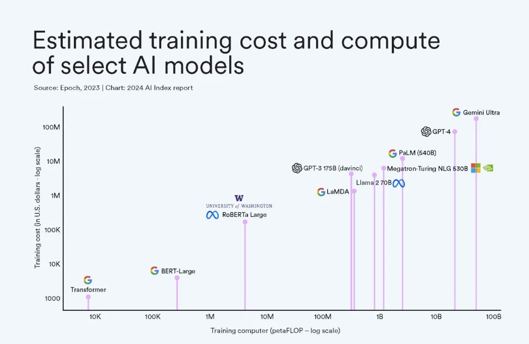 据人工智能指数(AI Index)的估计,最先进的人工智能大模型的培训成本已达到前所未有的水平。例如,OpenAI的GPT-4使用了价值约7800万美元的计算资源进行训练,而谷歌的Gemini Ultra的计算成本则高达1.91亿美元。