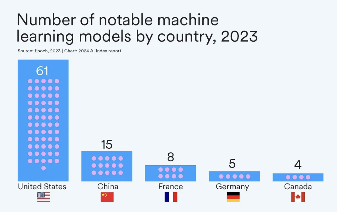 2023年,61个著名的人工智能模型来自美国机构,远超欧盟的21个和中国的15个。