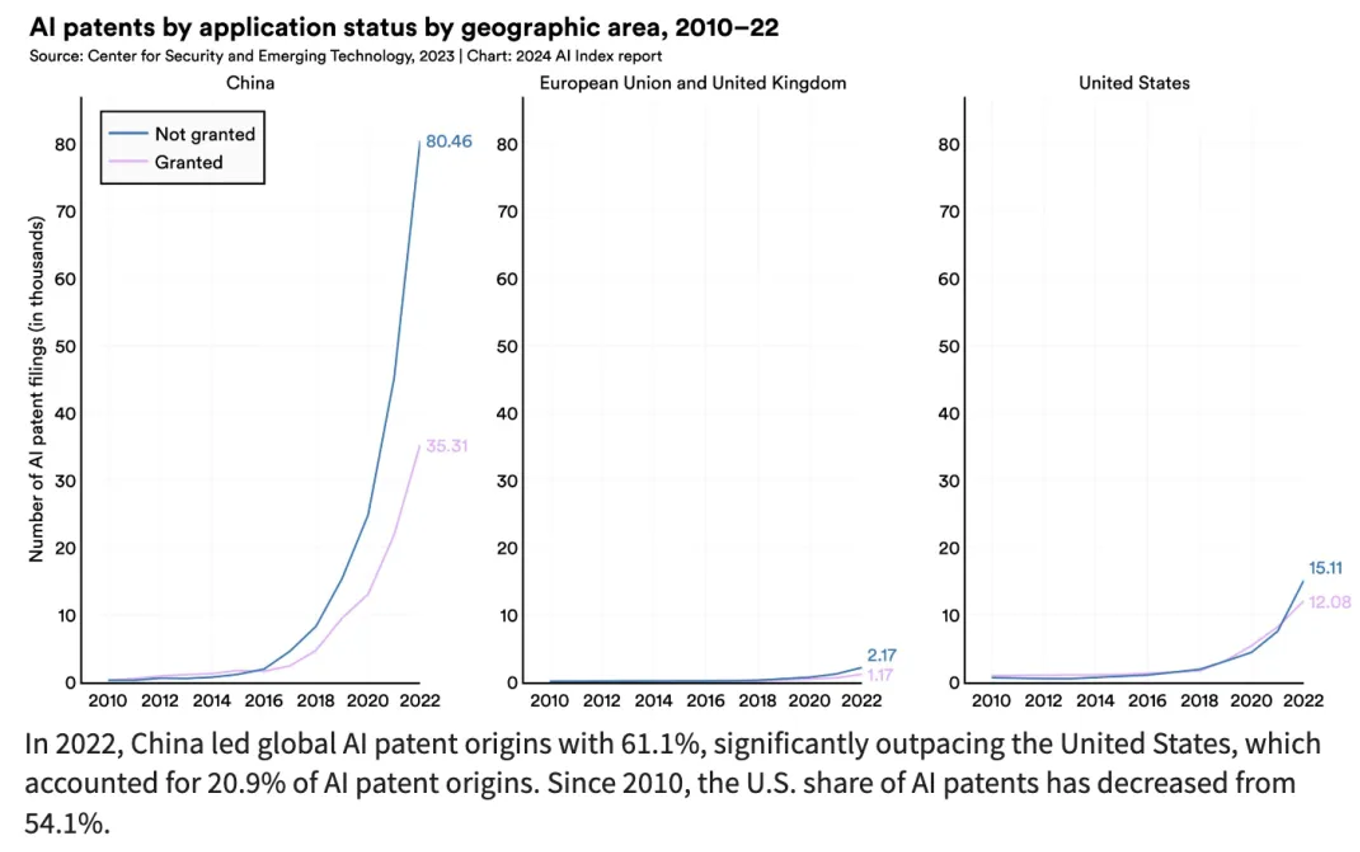 美国依旧是人工智能投资的首选之地。在2023年,美国人工智能领域的私人投资总额达到672亿美元,几乎是中国的9倍。不过,中国仍是美国在这一领域的主要竞争者,中国的机器人安装总量位居世界第一。同时,中国也拥有世界上绝大部分的人工智能专利,占比达到了61%。