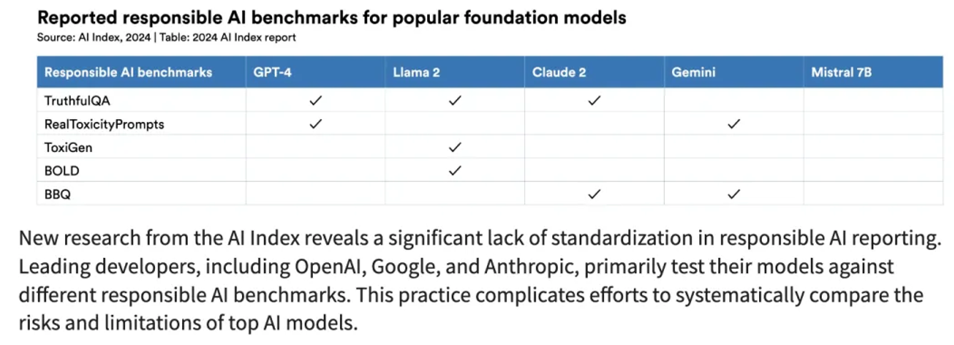 人工智能指标(AI Index)的最新研究显示,负责任的人工智能目前严重缺乏标准化指标。像OpenAI、谷歌和Anthropic这样的顶尖开发商在测试他们的模型时,都是依据各自不同的负责人工智能标准。而这里指的标准,更具体说是在处理与道德、法律、安全、隐私和社会影响等相关问题时所遵循的一系列准则、框架、评估指标和最佳实践。因此,这样各从己意的做法让比较顶级人工智能模型的风险和限制变得更复杂。