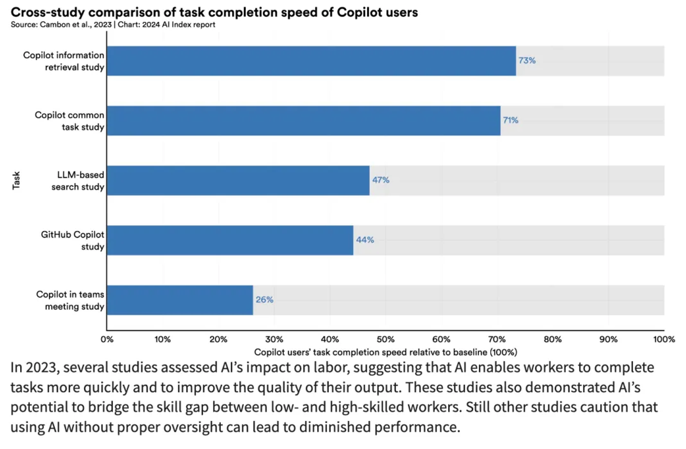 2023年,多项研究评估了人工智能对劳动力的影响,认为人工智能使打工人们能够更快地完成任务,并提高他们的产出质量。这些研究还表明,人工智能有可能缩小低技能和高技能工人之间的技能差距。不过,其他一些研究警告人们,在没有适当监督的情况下使用人工智能,不一定会提高工作绩效。