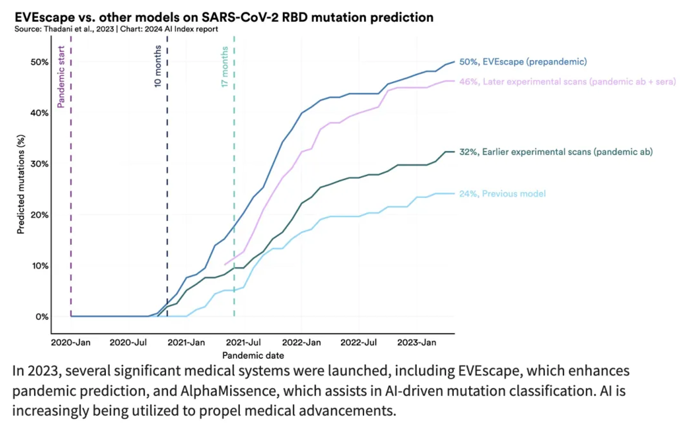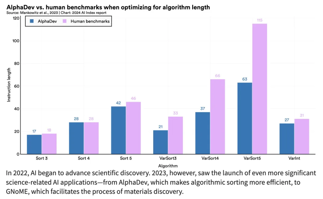 2022年,人工智能开始推动科学的发现。2023年我们开始看到更多与科学相关的人工智能应用启动了——使算法排序更高效的AlphaDev、促进材料发现过程的GNoME、到可在一分钟内提供相当准确的未来10天天气预报的GraphCast,以及成功对7100万种可能错义突变中约89%进行分类的AlphaMissence,这些都是很好的科学领域的AI应用。