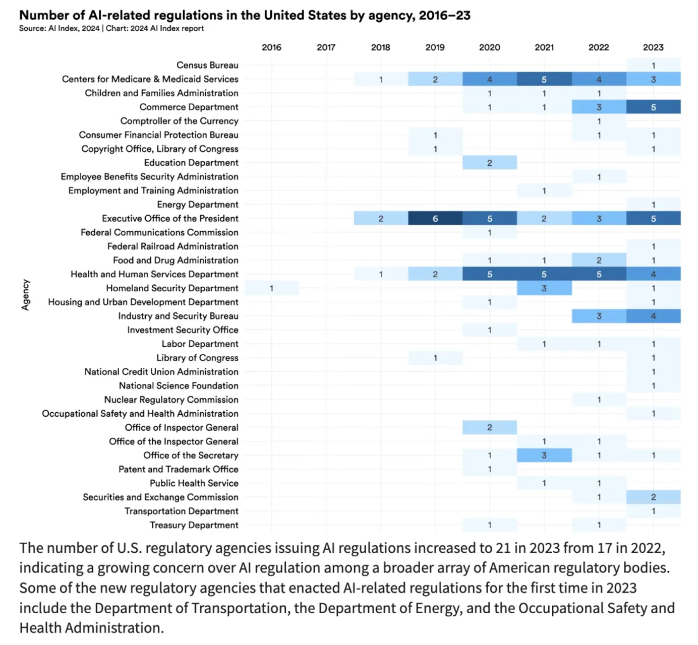 2023年,全球立法程序中有2175 次提及人工智能,几乎是上一年的两倍。美国人工智能相关法规的数量,在过去一年大幅增加。2023年与人工智能相关的法规有25项,而2016年只有1项。仅去年一年,人工智能相关法规的总数就增长了56.3%。其中一些法规包括生成式人工智能材料的版权指南和网络安全风险管理框架。