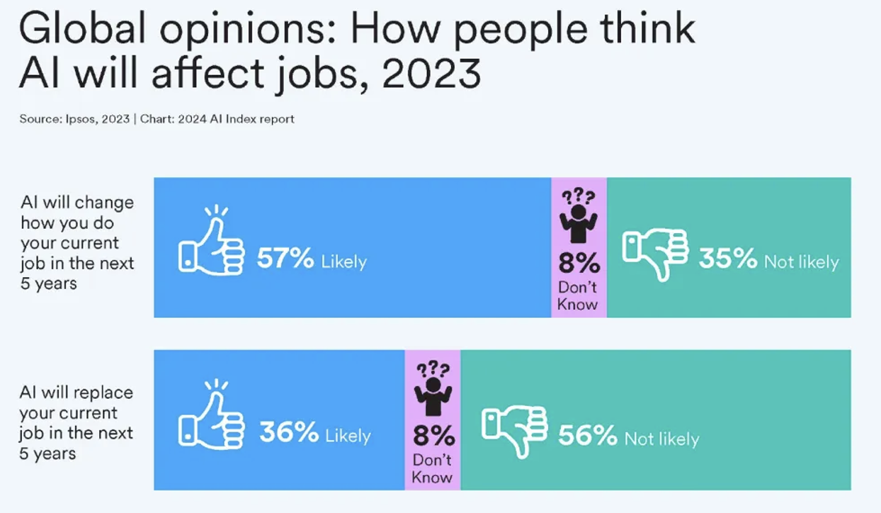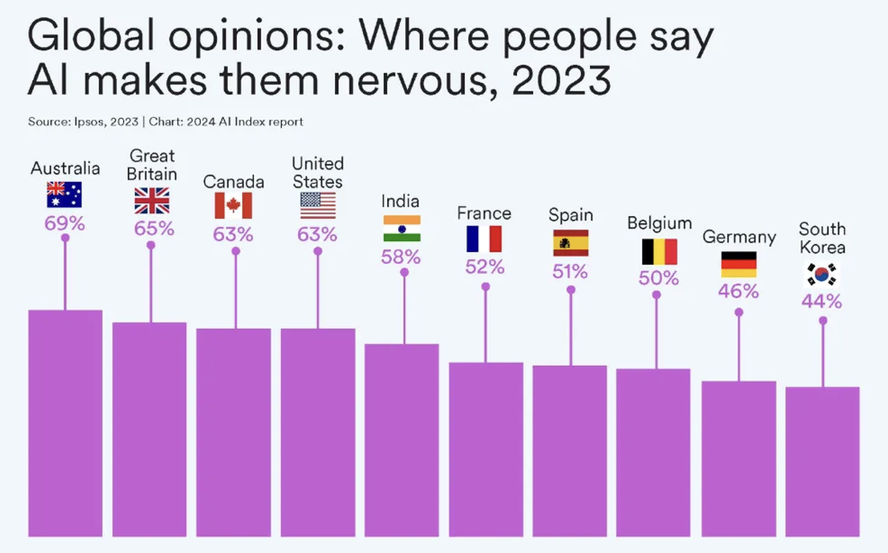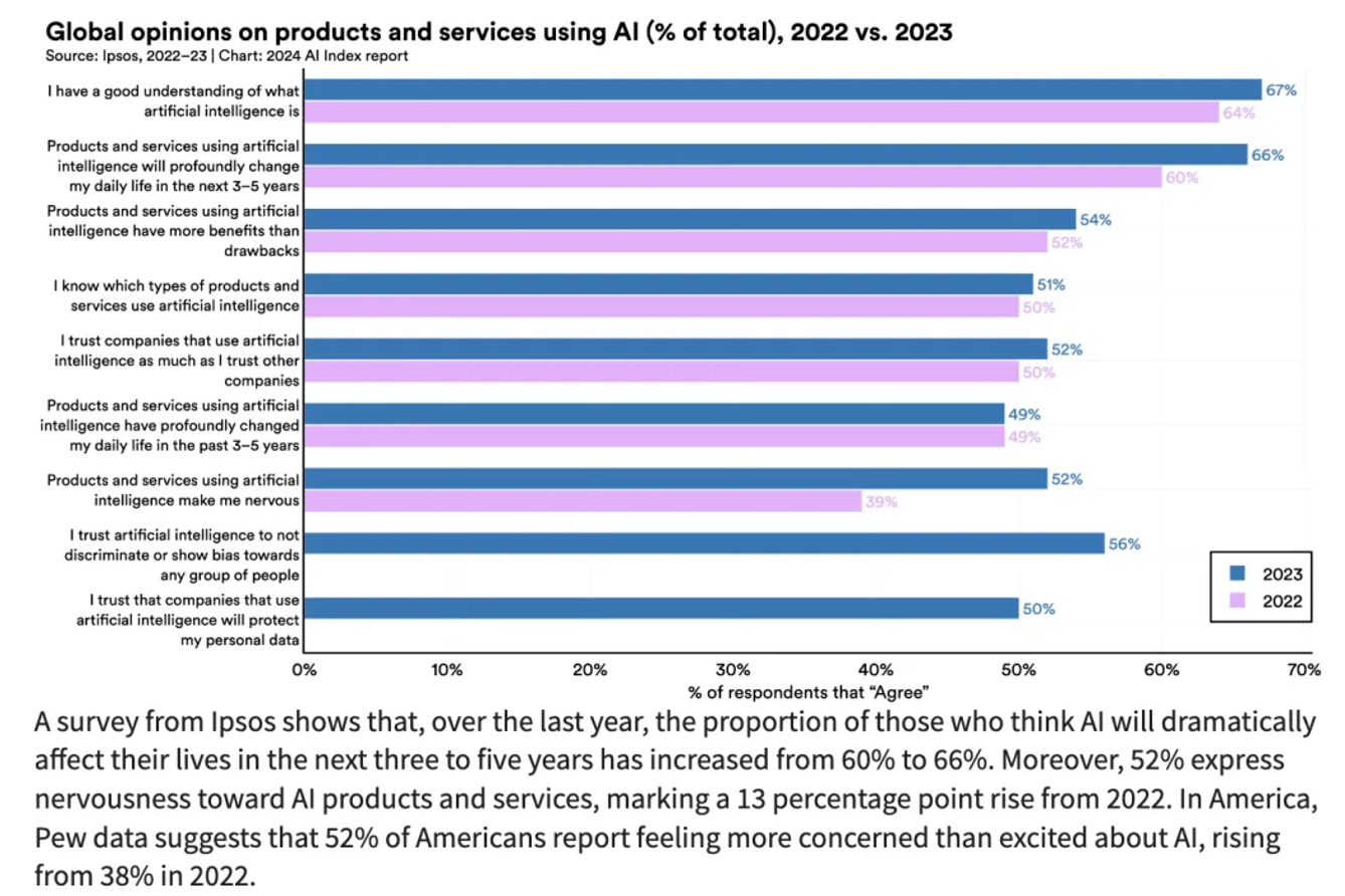 市场研究公司益普索(Ipsos)的一项调查显示,在过去一年中,认为人工智能将在未来 3-5 年内极大地影响他们生活的人的比例从 60%上升到 66%。此外,52% 的人对人工智能产品跟服务表示紧张和焦虑,比 2022 年上升了 13%。