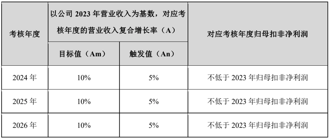 而管理层的激励考核标准,是以年度营收复合增长率5%为触发值,10%为目标值,且年度归母扣非净利润不低于2023年水平。