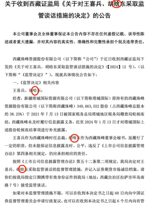 西藏珠峰4月25日公告,公司于4月19日披露了《关于收到西藏证监局<关于对王喜兵、胡晗东采取监管谈话措施的决定>的公告》《关于收到西藏证监局<关于对新疆塔城国际资源有限公司采取出具警示函措施的决定>的公告》《关于收到西藏证监局<关于对西藏珠峰资源股份有限公司、黄建荣采取出具警示函措施的决定>的公告》,由于公司工作疏忽,导致公告中存在部分错误。