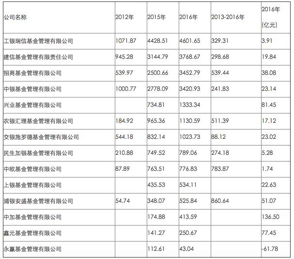 从大型基金公司2016年规模变动情况看,在资产管理规模超过1000亿元的24家大型基金公司中,银行系基金公司有7家。从上述基金公司2016年的规模变动情况看,上述7家银行系基金公司规模全部正增长,其中招商基金规模增加了952亿元,增幅高达38%;兴业基金规模增加599亿元,增幅高达81%。