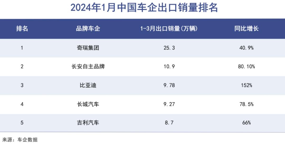 继2023年以翻倍的增速出口了近百万辆汽车后,今年的奇瑞继续高歌猛进,前三月销量近53万辆,同比大增60%以上,其中出口25万辆,同比增长41%。