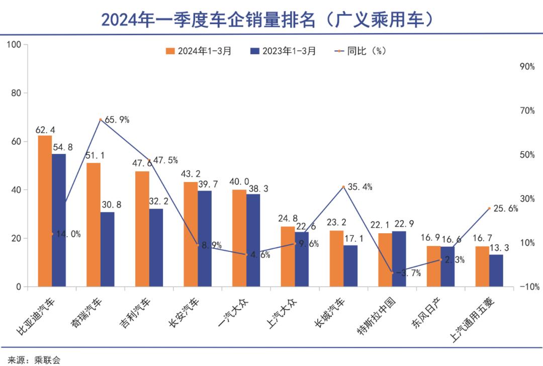 凭借海外爆卖,奇瑞在今年一季度强势晋级乘用车销量第二名,反超一汽、长安、吉利,仅次于比亚迪,而且还是TOP10中增速最快的车企。