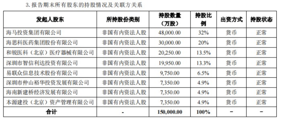 2017年,海保人寿由8家公司联合成立。其中,海马集团、海思科(002653.SZ)、易联众(300096.SZ)各占总股份的20%,并列为第一股东。
