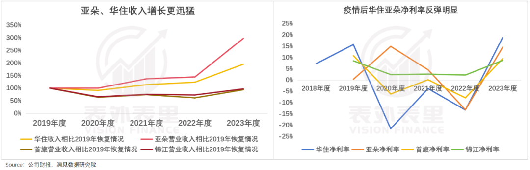 国内几家巨头的表现,也验证了这一点。可以看到,同样是趁势抄底、大搞加盟,2022-2023年疫后恢复期里,无论是收入还是净利润反弹的表现,华住、亚朵都远高于锦江、首旅。