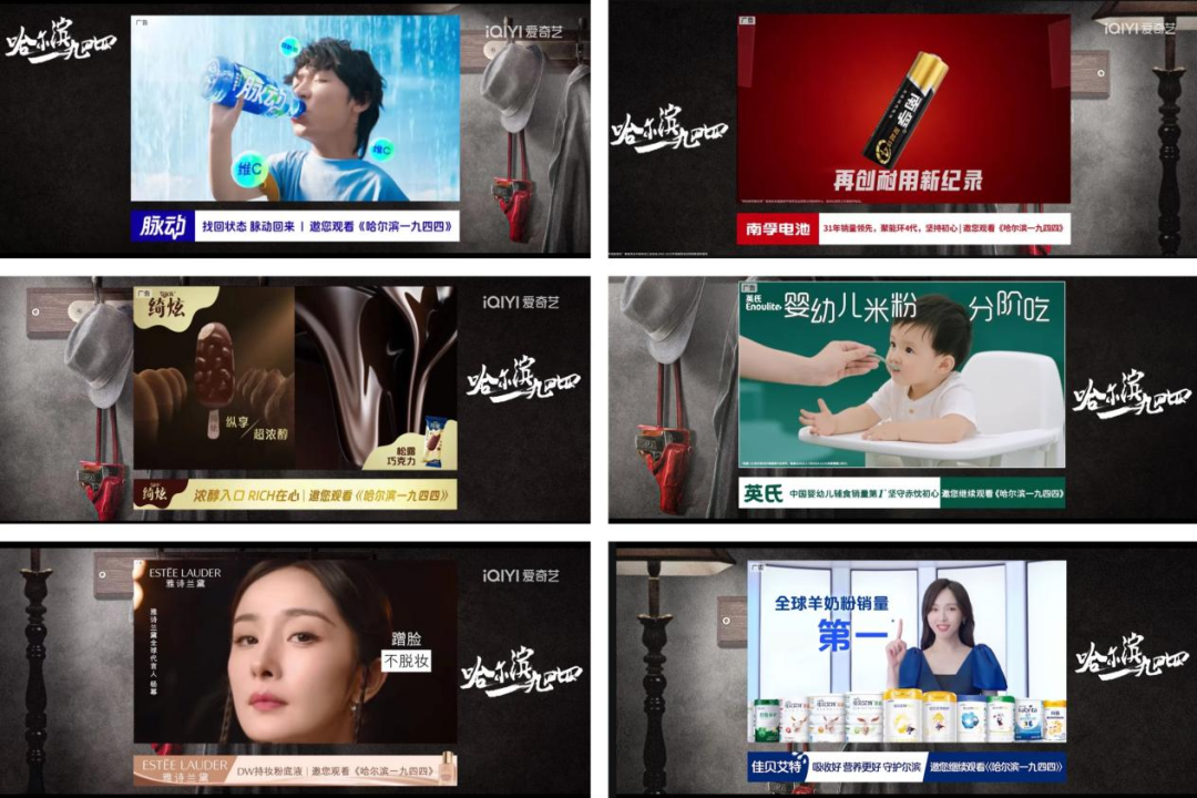 另一边,在《春色寄情人》前一天开播的《哈尔滨一九四四》,首播共计有8个视频广告,品牌包括脉动、南孚、巧乐兹、雅诗兰黛、佳贝艾特、英氏、椰号、淘淘氧棉。