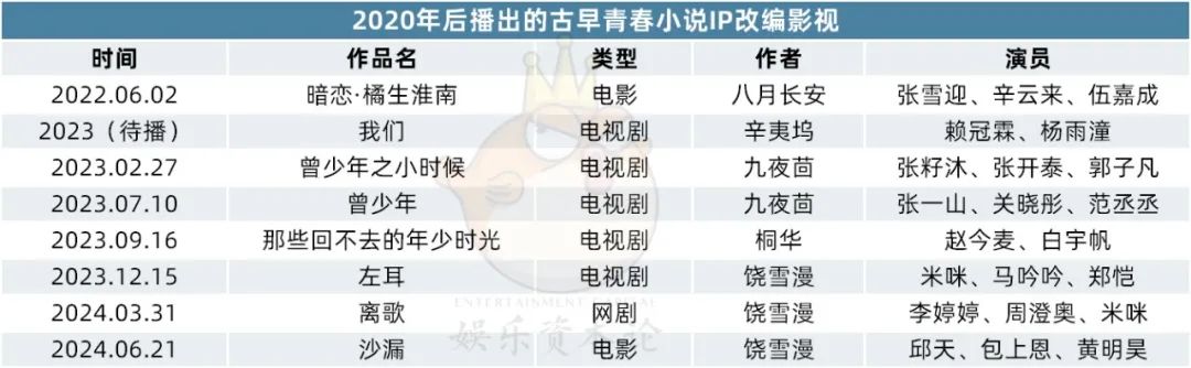 反观疼痛类IP改编,饶雪漫此前上线的改编剧《小妖的金色城堡》已经是2018年的事了,明晓溪最后一部上线的青春小说改编剧新版《泡沫之夏》同样也在2018年,辛夷坞的影视改编剧最后则停留在2019年《山月不知心底事》,不仅都未能得到热播、爆剧的效果,往后其他IP的改编也都举步维艰。