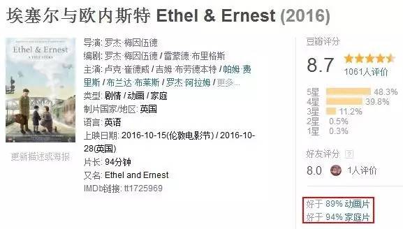 看看它爆棚的口碑,我们没有理由错过这么一部难得的高分手绘动画。豆瓣8.7,好于89%动画片,好于94%家庭片;