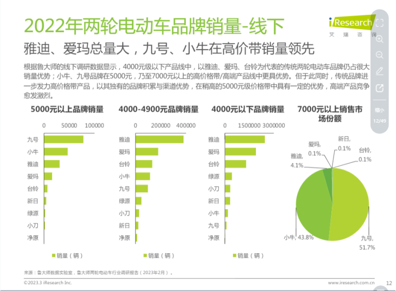 艾瑞咨询发布的《2023年中国两轮电动车行业白皮书》数据显示,2022年电动自行车的线下销量方面,在4000-4900元的品牌销量中,小牛排在第四位,落后于雅迪、爱玛和台铃。(业内普遍认为,4000元以上的两轮电动车就属于高端市场)5000元以上品牌销量中,小牛落后于九号,排在第二位。7000元以上产品的市场份额中,小牛占比43.8%,也落后于九号。