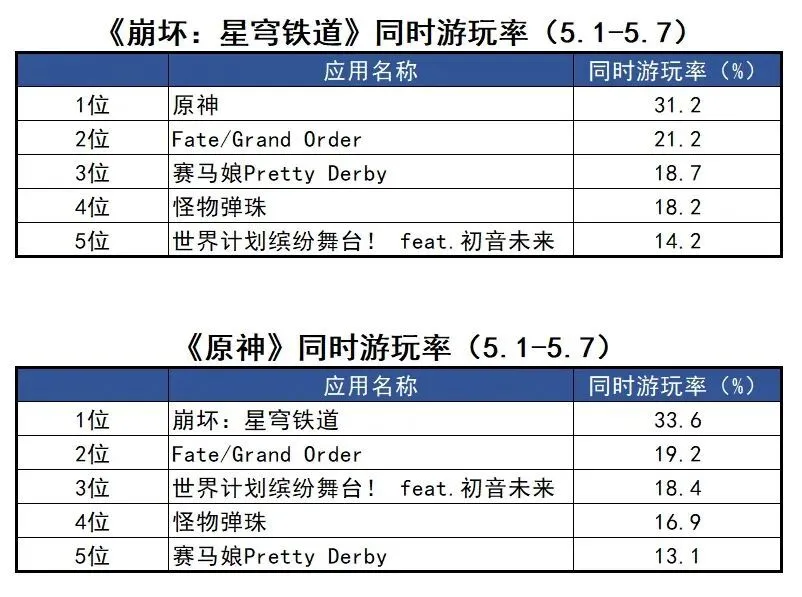 此前,日本游戏调研机构Gameage报告显示,光是日本市场,首月就有超三成《星铁》玩家同时玩《原神》。