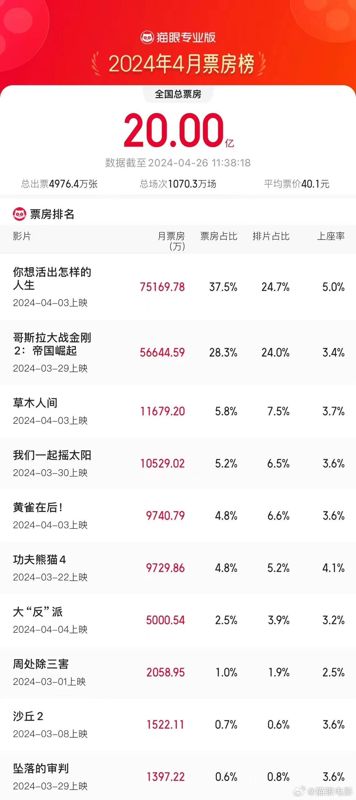 据猫眼专业版数据,4月26日11时38分,2024年4月总票房破20亿,《你想活出怎样的人生》《哥斯拉大战金刚2:帝国崛起》《草木人间》分列4月票房榜前三位。