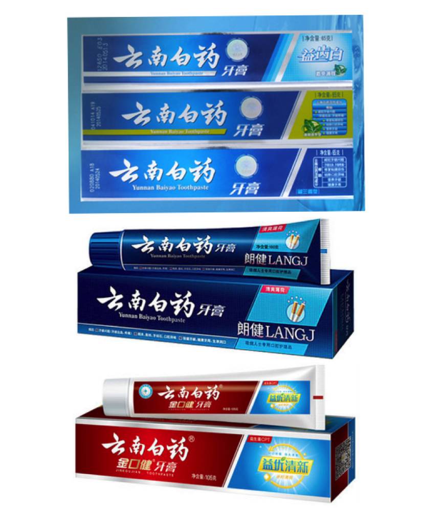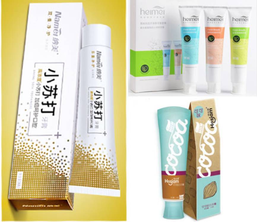 一般来说,牙膏的包装由长方体的纸质外包装和铝塑材质的软管内包装构成,而外包装和内包装在颜色、图案上的构成基本一致。
