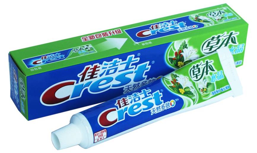 以名为“佳洁士草本水晶薄荷”牙膏的包装为例,“佳洁士Crest”即为品牌名和LOGO,“草本”是其主打概念,“健齿清新”则是产品主打功效,“清爽薄荷”表明产品的味道,薄荷和金银花则是包装的主图案。