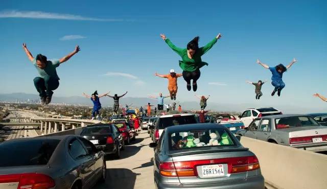 电影在一段将近5分钟的歌舞长镜头中拉开帷幕。堵得水泄不通的公路上,人们以音乐来消磨冗长的时光。顿时,焦躁不堪的他们忽然蹿出车窗载歌载舞,现实的焦虑和梦想的形状以暗喻的形式喷涌而出。