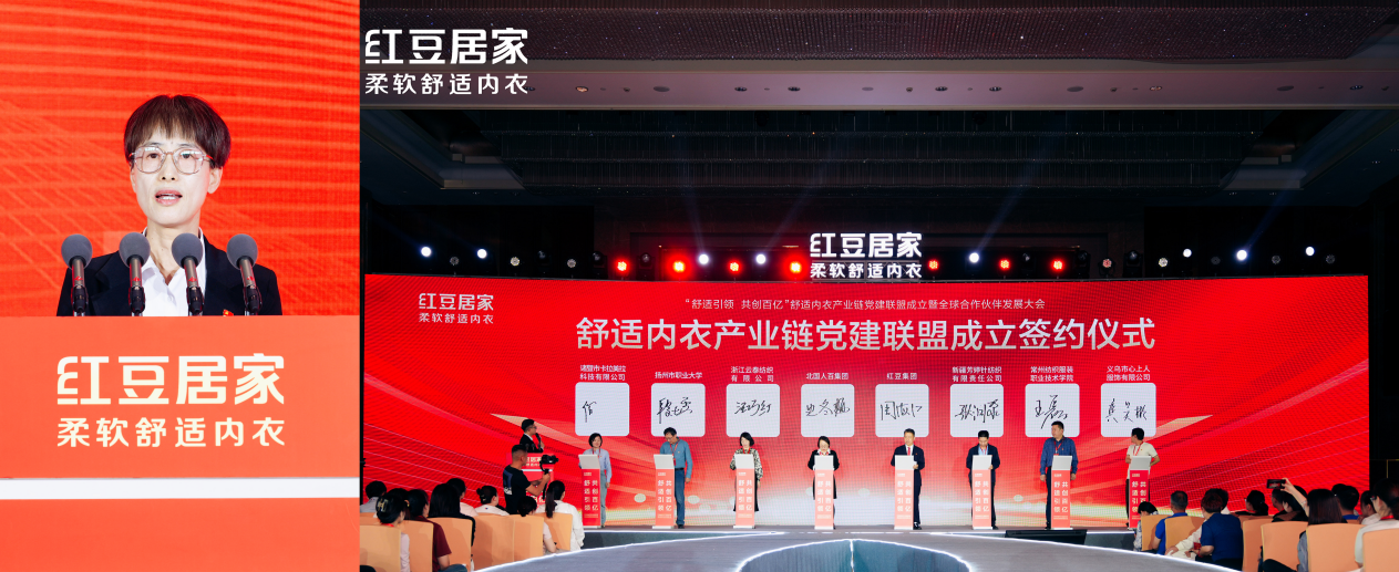 同时,红豆集团党委副书记、红豆居家公司党委书记、董事长钱静在大会上宣读共建舒适内衣产业链党建联盟倡议书。她表示,红豆居家将积极发挥党建引领作用,与高校党支部、供应链和渠道党支部等力量深度融合,共同推动内衣产业的健康发展。通过党建联盟的建立,红豆居家将进一步提升品牌形象和社会责任感,为内衣行业注入新的活力。