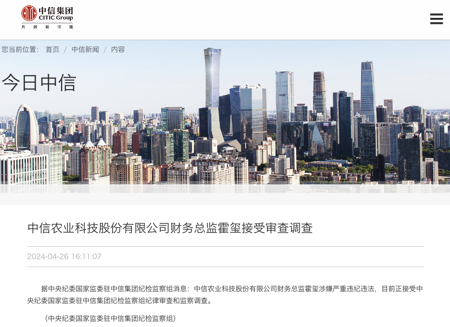 4月26日,据中央纪委国家监委驻中信集团纪检监察组消息:中信农业科技股份有限公司财务总监霍玺涉嫌严重违纪违法,目前正接受中央纪委国家监委驻中信集团纪检监察组纪律审查和监察调查。