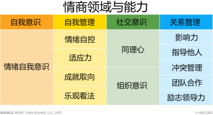两位专家指出,情商由四个领域构成:自我意识、自我管理、社交意识和关系管理。这四个领域下有12项情商能力。对很多人来说,他们的这12项情商能力的高低是不均衡的,这导致了所谓的情商缺陷。