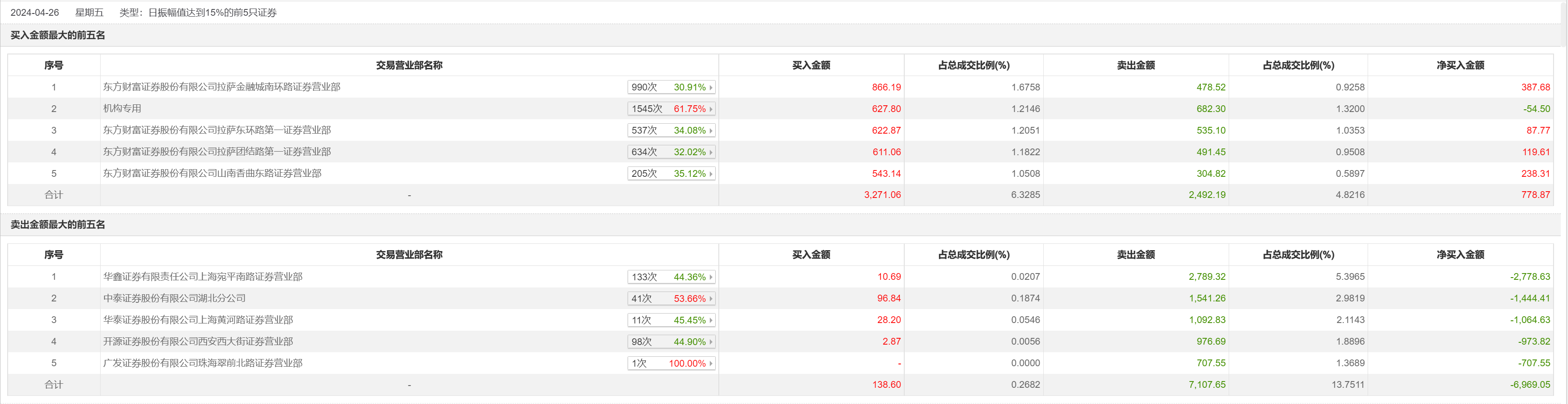 4月26日,中设股份今日跌5.7%,龙虎榜数据显示,上榜营业部席位全天成交1.3亿元,占当日总成交金额比例为25.17%。其中,买入金额为3409.66万元,卖出金额为9599.84万元,合计净卖出6190.18万元。