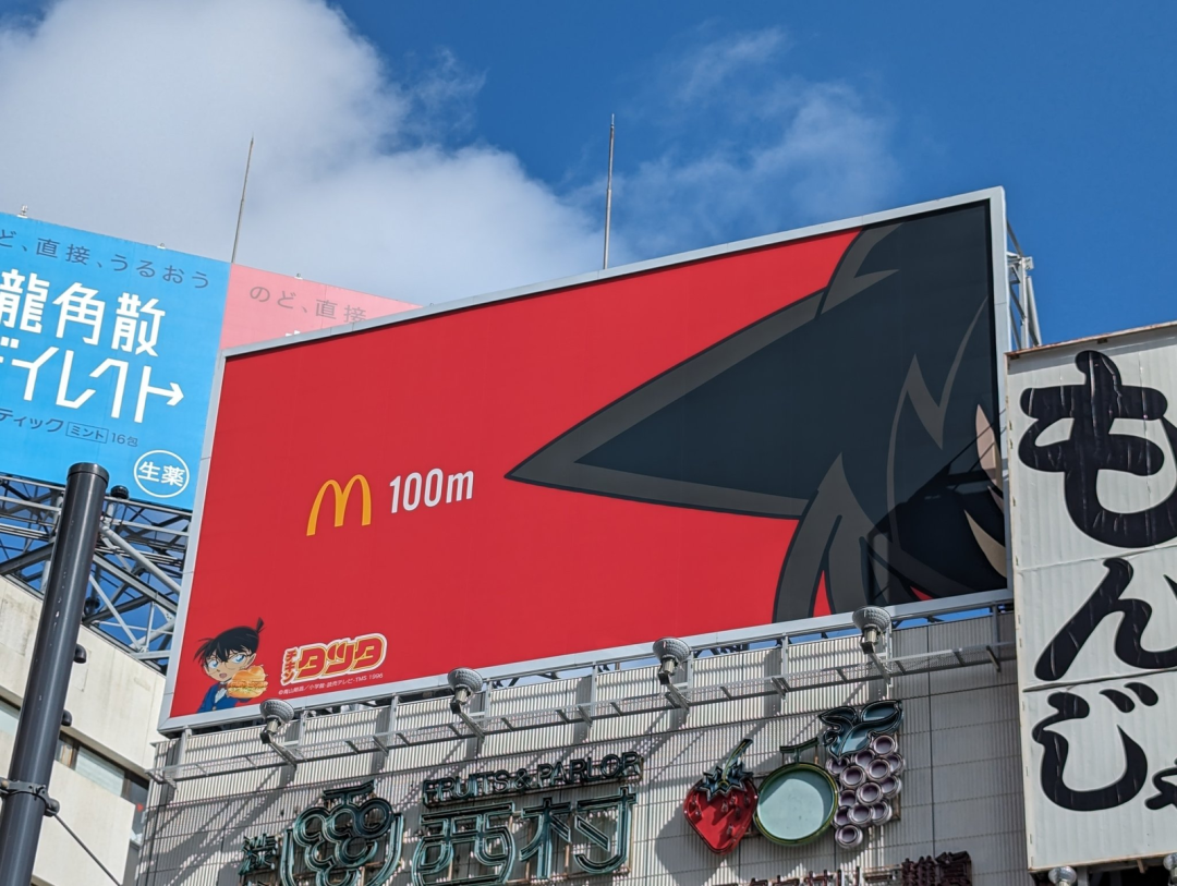 4月17日,日本东京涩谷区“西村大厦”的外墙上,出现了一块巨型指路牌。牌子的三分之一都被一个“角”占据着,左侧是“100m”和麦当劳的金拱门logo,指示着:往左走100米,就是麦当劳了。