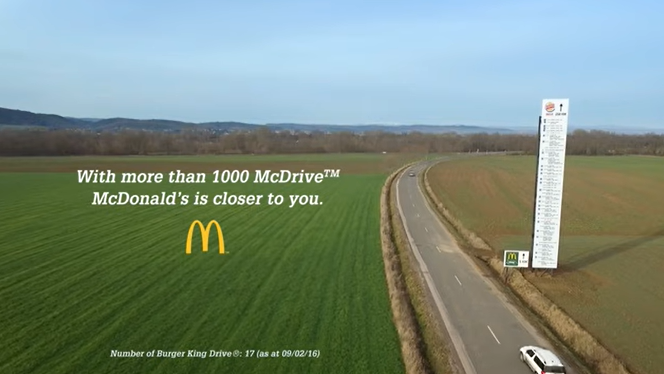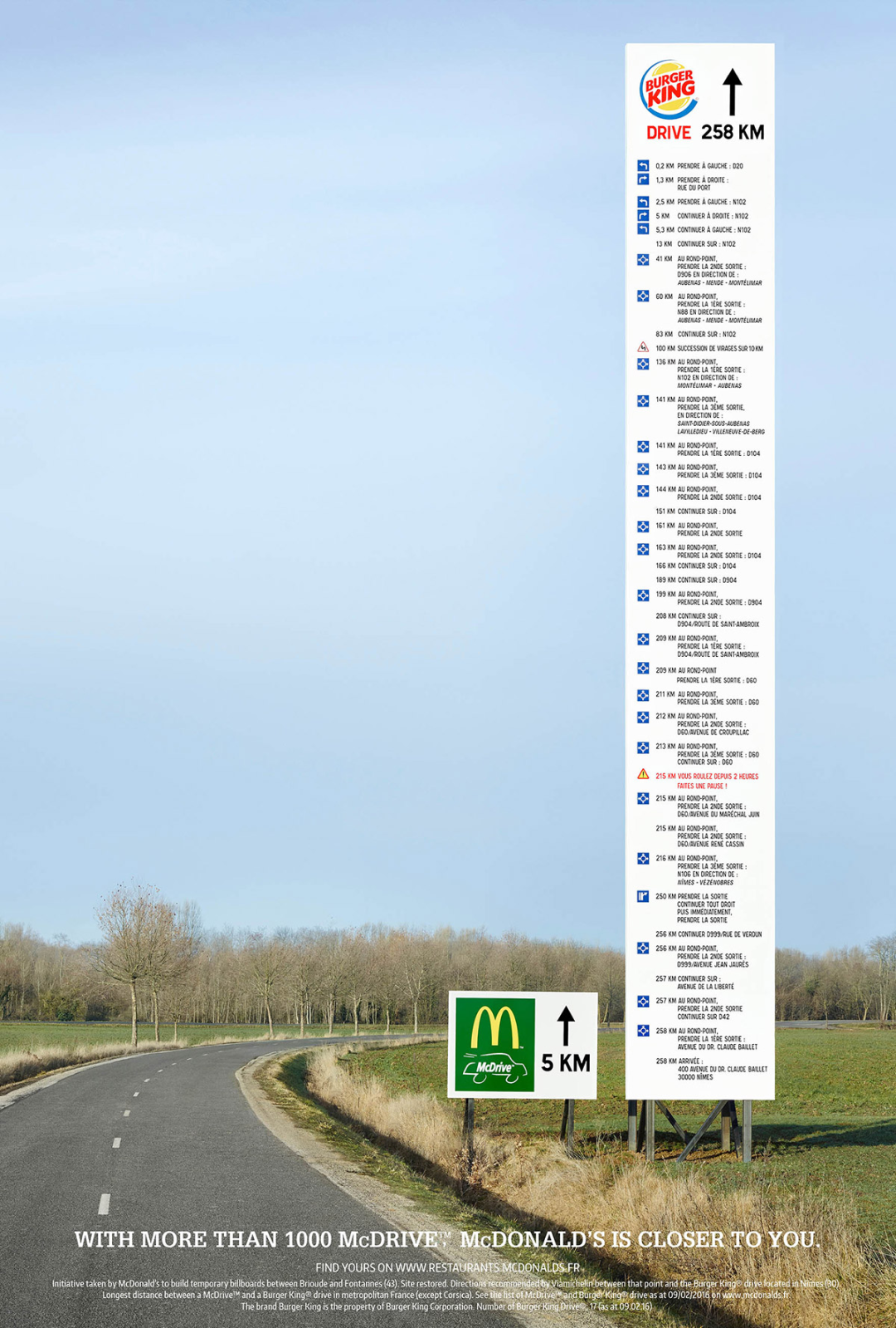 这次仍然是TBWA的创意。2016年,他们在法国小镇的公路上放置了一块麦当劳指路牌。特别之处在于,他们还“不怀好意”地给汉堡王做了一块。