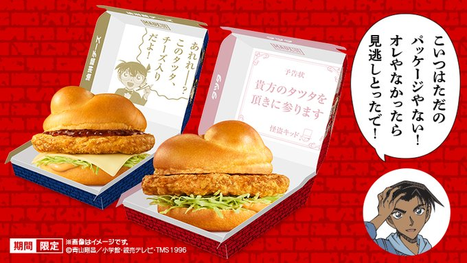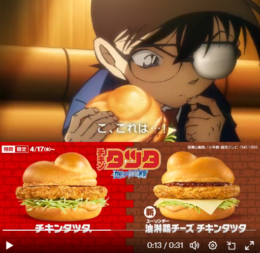 指路牌上柯南右侧的配字“チキンタツタ(龙田炸鸡)”,还提示了此次的联名产品之一——龙田炸鸡堡。这款自1991年首次亮相以来、已多次回归的明星产品,就是柯南拿在手中的汉堡。此外还有一款在此基础上推出的新品——“油淋鸡芝士龙田炸鸡堡”。