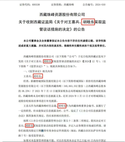 4月25日,上交所对西藏珠峰资源股份有限公司(600338.SH) (简称“西藏珠峰”)及有关责任人予以监管警示,称上市公司公告信息披露不准确,反映出公司日常信息披露存在缺陷,多份公告中出现低级文字错误,造成较大影响。此前4月18日西藏珠峰一篇公告因错别字引发热议——董秘名字竟出现四个版本,分别是“胡晗东、胡哈东、胡啥东、胡眕东”。