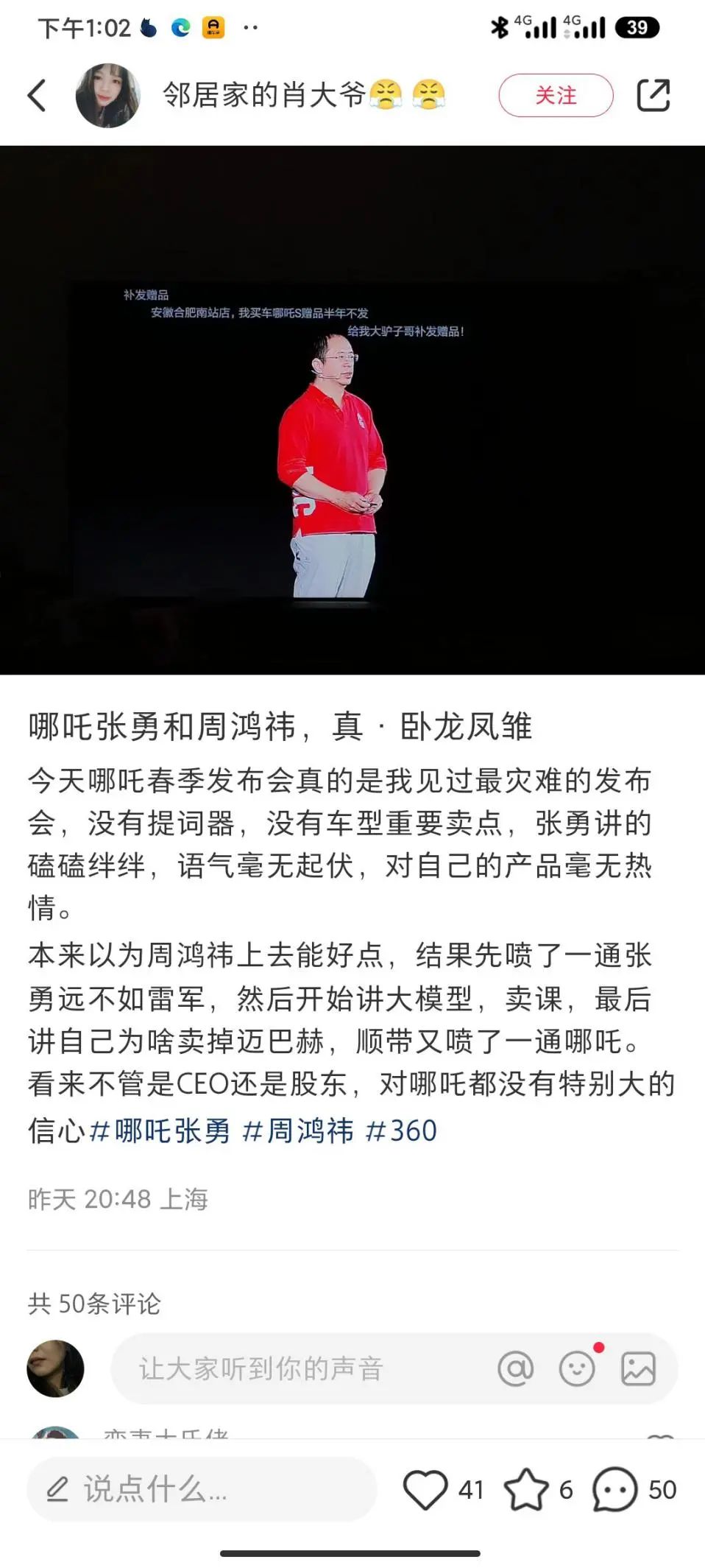 “哪吒张勇和周鸿祎,真是一对卧龙凤雏。”全程看完发布会的“肖大爷”表示,整场发布会没有提词器,没有车型卖点。张勇讲的磕磕绊绊,对自己的产品毫无激情。
