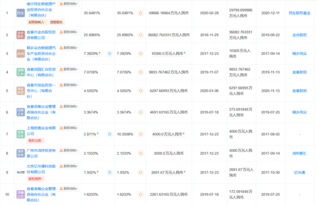 天眼查数据显示,合众新能源汽车股份有限公司是哪吒汽车母公司,最大的2个持股方为南宁民生新能源产投(占比35.64%)、宜春金合(25.89%),他们分别代表代表南宁国资、宜春国资。
