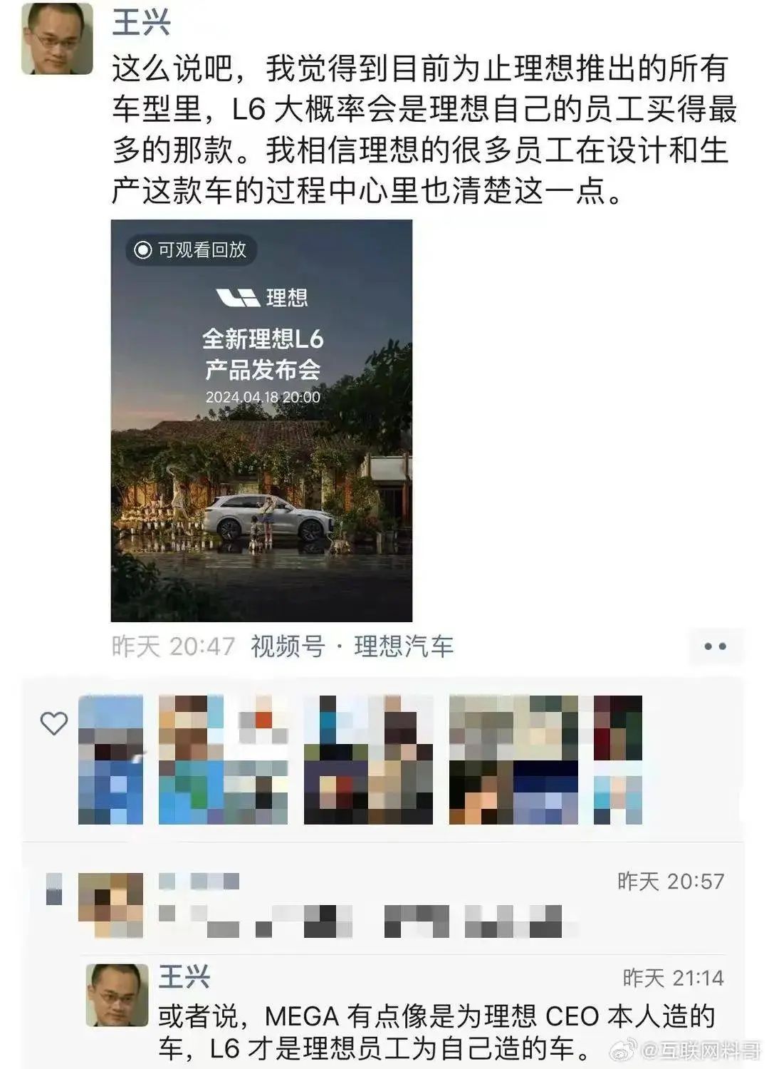 四月份,理想回归了增程主航道,不仅发布了20万价位的理想L6,还宣布给理想老车主现金补贴,意图重新主导增程市场。除了投资人雷军为其车展站台,另一位理想投资人王兴也在朋友圈饱含深情的帮忙吆喝:“mega是给CEO本人造的车,而理想L6是给员工造的车。”