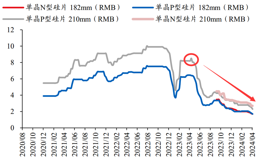 更何况,2023年第二季度硅片价格已经有一轮暴跌,截至去年6月30日,已经跌去一半——P型210每片只要4块钱。假使TCL中环在去年一、二季度囤了大量的硅料或硅棒,那么在其半年报、三季报中,应该就已经进行存货跌价减计了。