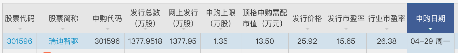 根据安排,五一节假日前,4月29日,打新者仍有一只新股可以考虑申购:瑞迪智驱(301596.SZ)。