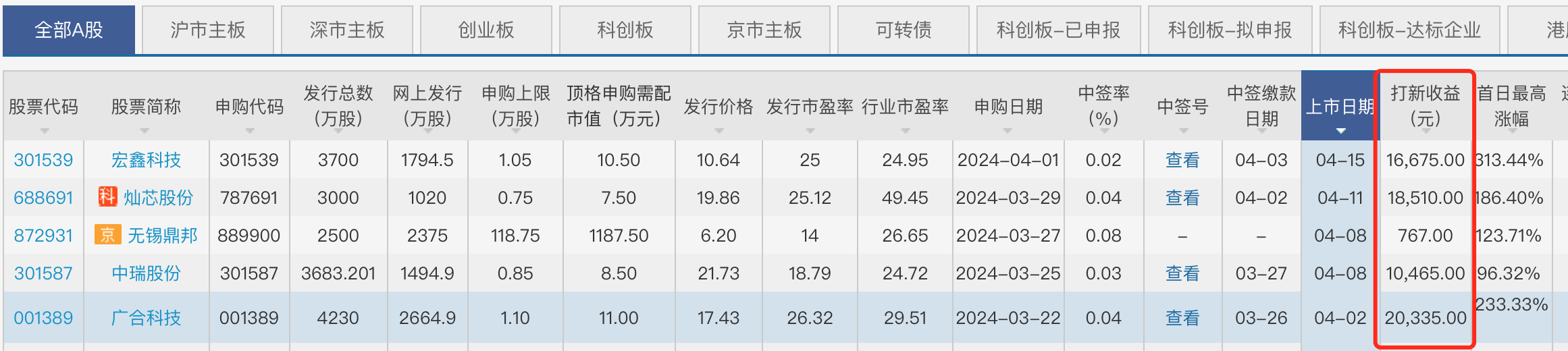 除此外,4月8日上市的中瑞股份(301587.SZ),以及4月2日上市的广合科技(001389.SZ),首日极限的打新收益也均超过了万元。只是新股刚上市前几日的表现多以回落为主,中签者逢高落袋为安或为上策。