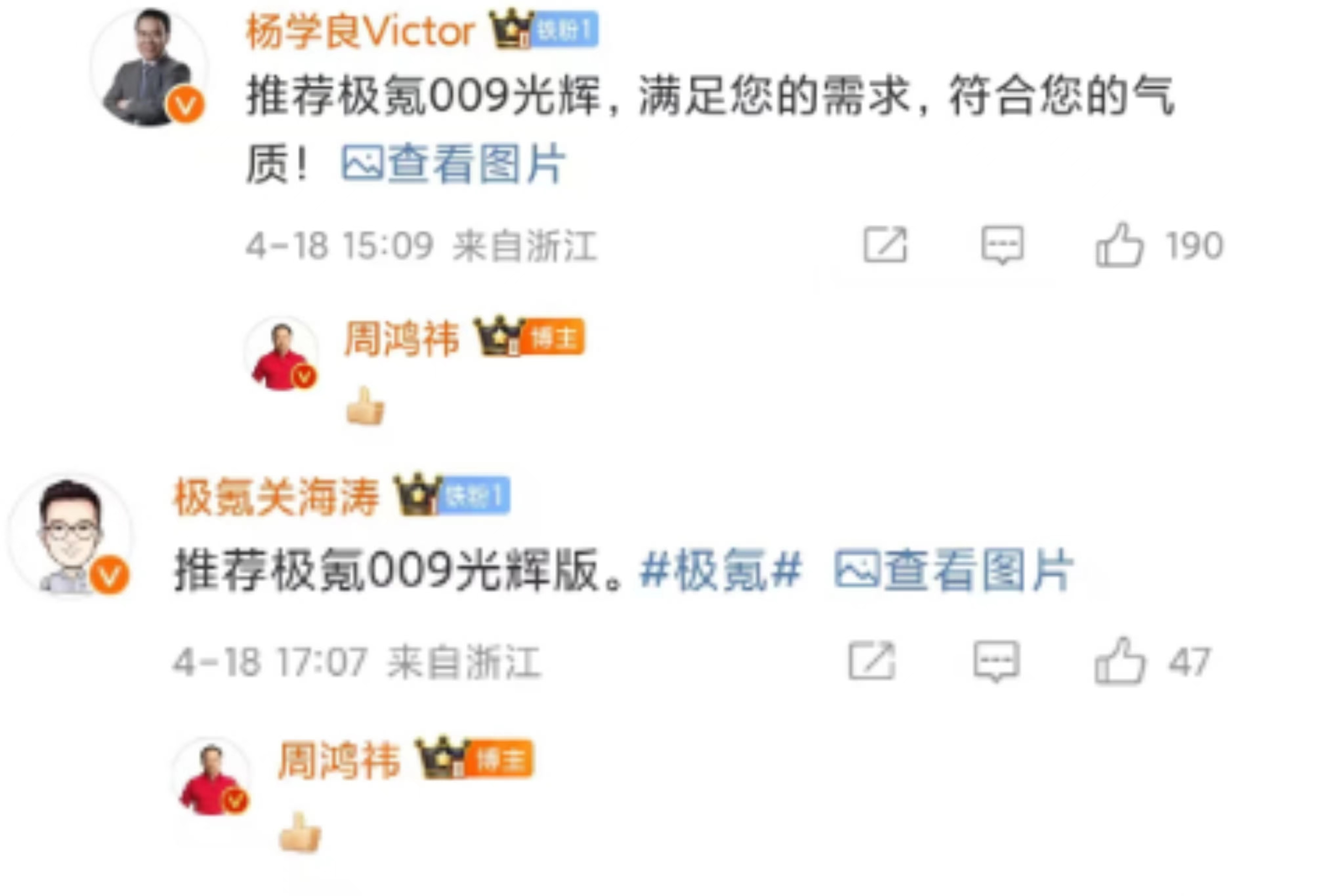 此前,周鸿祎在微博发帖公开要车之时,吉利控股集团高级副总裁杨学良、极氪智能科技CMO关海涛火速跑到评论区团建。