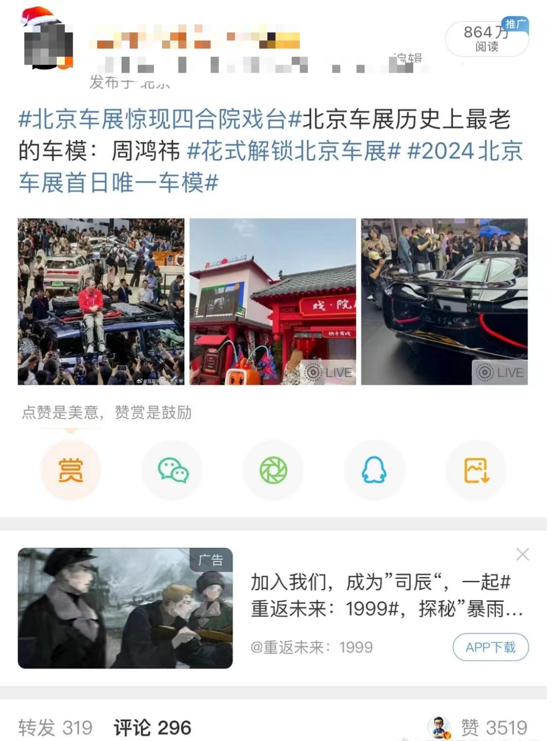 当然,从微博内容也能发现,起码在北京车展的第一天,主角不是车企,也不是抖音快手微博和小红书,而是会搞流量的跨界互联网大佬——一个是身着红色T恤的周鸿祎,一个是绿色衬衫的雷军。