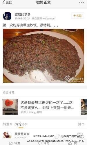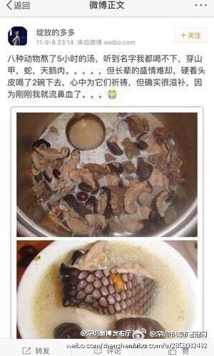 据“深圳微博发布厅”信息显示,“绽放的多多”分别在2011年9月和2012年3月两次在微博中称吃穿山甲,并晒出图片。微博配文还称,“喝了穿山甲、蛇、天鹅肉等八种动物熬制的汤,很滋补,流鼻血”“吃穿山甲血炒饭”等。