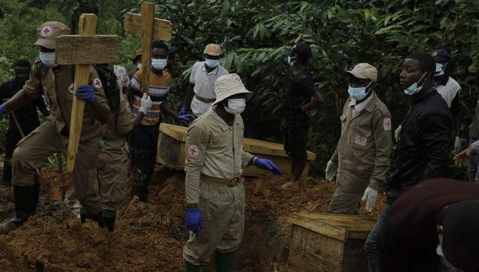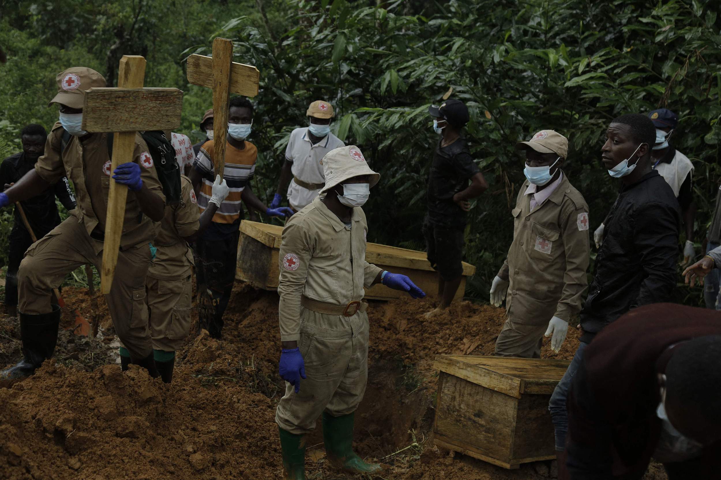 2025年9月10日,刚果(金)恩托约,红十字会志愿者在一场葬礼上围在棺材旁,棺材中是“民主同盟军”袭击事件遇难者的遗骸。来源:视觉中国