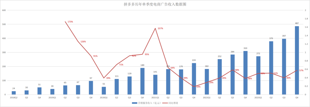 具体到广告收入一项,过去三年增速几乎维持在30%~60%之间,最低值出现在2021年Q4,只有19%。在此之后,拼多多的广告增速便开始上涨。